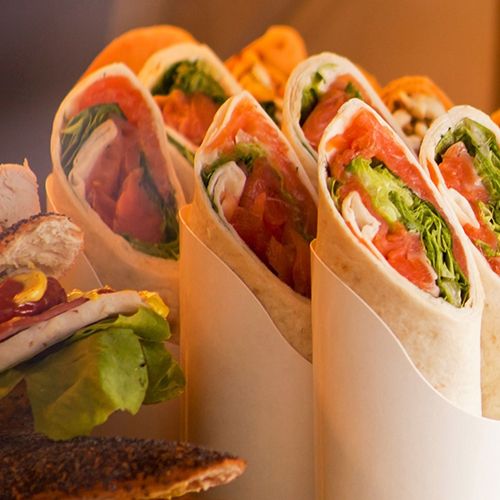 - Vegane und vegetarische Optionen wie Wraps, Quiches oder Salate