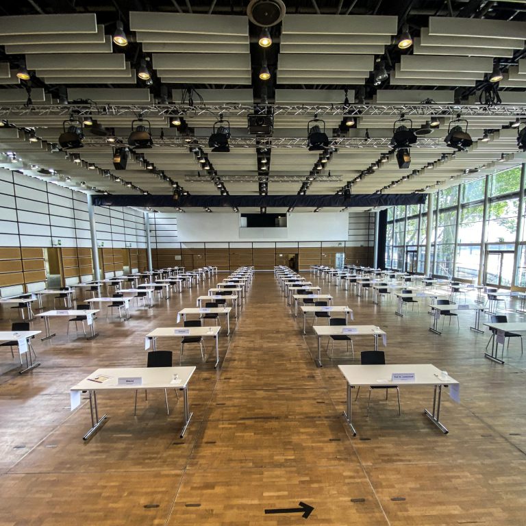 Am 8. Mai 2020 bewirteten wir im Radschlägersaal der Rheinterrasse die Bezirksregierung mit 80 Gästen. Der Saal konnte parlamentarisch bestuhlt werden – unter Berücksichtigung der Coronaregeln mit jeweils 1,50 m Abstand zwischen den Tagungsteilnehmern.